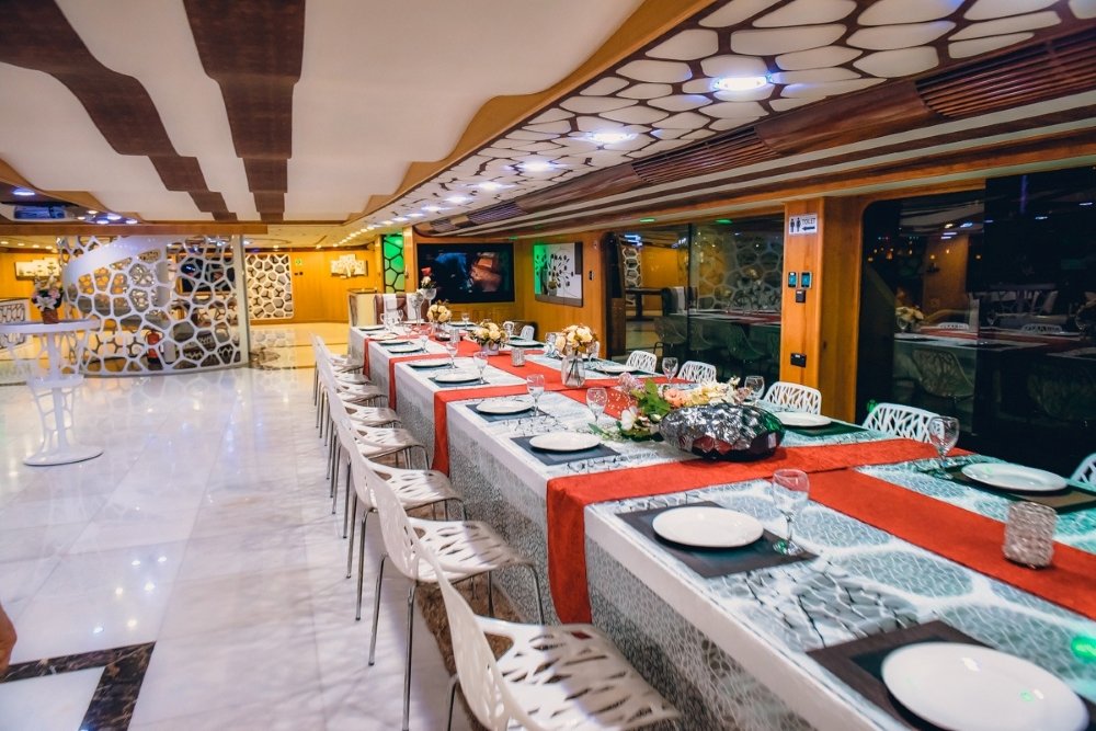 The Mega Yacht offers comfortable lower deck seating arrangements, ensuring guests can relax and enjoy the festivities in a spacious and inviting environment while taking in stunning views and entertainment.